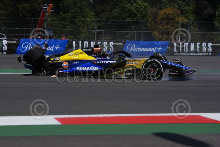 CIUDAD DE MÉXICO, 24OCTUBRE2024.- El piloto de la escuderia William Racing, Alex Alban se estrello contra el auto de la escudería Ferrari que conducía Oliver Bearman durante la primer práctica del Gran Premio de la Ciudad de México en el Autódromo Hermanos Rodríguez. FOTO: GALO CAÑAS/CUARTOSCURO.COM