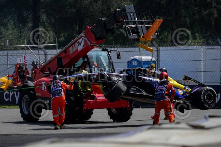 CIUDAD DE MÉXICO, 24OCTUBRE2024.- El auto de la escuderia Williams Racing que conducía Alex Albon es retirado tras chocar contra el auto de la escudería Ferrari que conducía Oliver Bearman durante la primer práctica del Gran Premio de la Ciudad de México en el Autódromo Hermanos Rodríguez. FOTO: GALO CAÑAS/CUARTOSCURO.COM