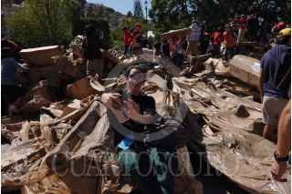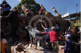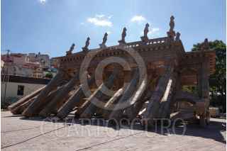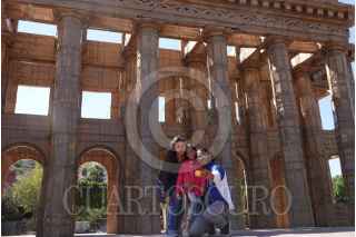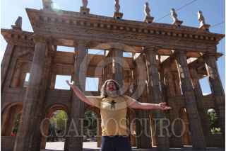 GUANAJUATO, GUANAJUATO, 26OCTUBRE2024.- En el marco del 52 Aniversario del Festival Internacional Cervantino, una familia se toma una selfie en la réplica de Teatro Juárez, elaborada principalmente por el artista francés Oliver Grossetête y en colaboración con espectadores, antes de ser destruida como parte del performance colaborativo. FOTO: GRACIELA LÓPEZ/CUARTOSCURO.COM