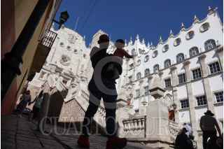 GUANAJUATO, GUANAJUATO, 26OCTUBRE2024.- En el marco de la 52 edición del Festival Internacional Cervantino, un padre acompañado de su hija caminan frente a la Universidad de Guanajuato. FOTO: GRACIELA LÓPEZ/CUARTOSCURO.COM