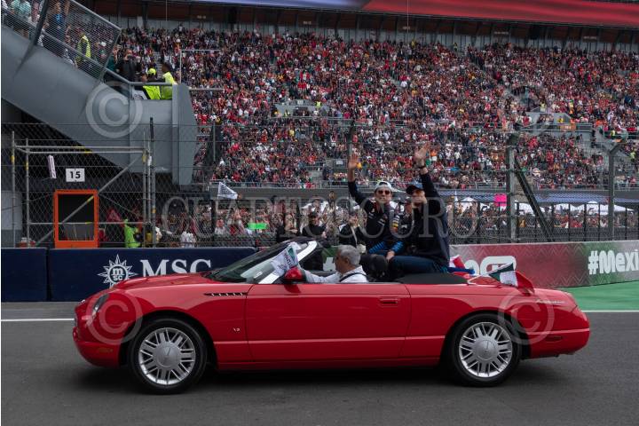 CIUDAD DE MÉXICO, 27OCTUBRE2024.- Los pilotos de Oracle Red Bull Sergio “Checo” Pérez y Max Verstappen durante el Desfile de las escuderías que compiten en la edición 2024 del Gran Premio de la Ciudad de México de la Fórmula 1 en el Autódromo Hermanos Rodríguez. FOTO: GALO CAÑAS/CUARTOSCURO.COM