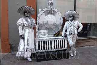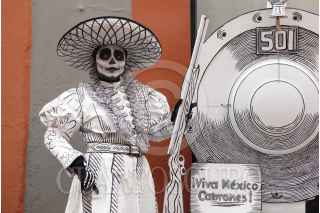 GUANAJUATO, GUANAJUATO, 27OCTUBRE2024.- En vísperas de la celebración del Día de Muertos, una pareja de charros caracterizados de calaveras espera que los transeúntes se tomen fotografías en el centro de Guanajuato. FOTO: GRACIELA LÓPEZ/CUARTOSCURO.COM