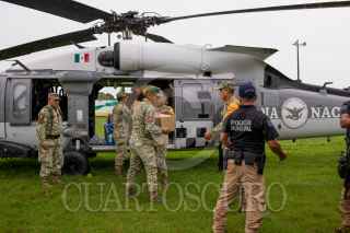 MINATITLÁN, VERACRUZ, 28OCTUBTE2024.- Continúa la emergencia por el desbordamiento de los ríos en Veracruz. Decenas de localidades permanecen incomunicadas, y el ejército ha desplegado puentes aéreos para llevar alimentos y agua a las familias afectadas. Tropas del 45° Batallón de Infantería, pertenecientes a la 29ª Zona Militar de Minatitlán, mantienen activado el plan DN-III-E en al menos nueve municipios de la zona sur de Veracruz, debido a las inundaciones. Con el apoyo de una aeronave de la Guardia Nacional, se han establecido puentes aéreos para abastecer de víveres y agua potable a las zonas más afectadas. El río Coatzacoalcos se ha desbordado en el malecón ribereño, alcanzando un nivel de 2.50 metros, lo que supera su escala crítica y afecta severamente la zona comercial, así como las calles del Playón Sur. FOTO: ANGEL HERNÁNDEZ/CUARTOSCURO.COM