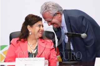 CIUDAD DE MÉXICO, 29OCTUBRE2024.- Clara Brugada, jefa de Gobierno , dialoga con Pablo Yanes, secretario de Educación, durante el evento. FOTO: DANIEL AUGUSTO/ CUARTOSCURO.COM