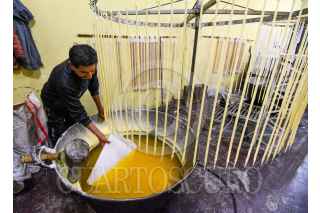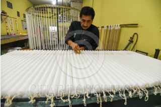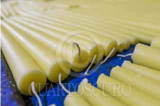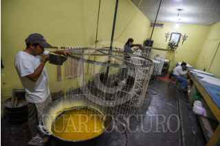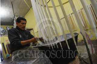 TOLUCA, ESTADO DE MÉXICO, 29OCTUBRE2024.- Cirilo Araujo tiene más de 30 años dedicándose a la elaboración artesanal de ceras, cirios y veladoras, siendo la tercera generación en su familia, colocando pabilos de algodón inicia a bañarlos con parafina derretida hasta obtener el grosor deseado y en hora y media logra tener 100 ceras, en su taller Cerería Santa Cruz trabajan todo el año pero unos meses antes del Día de Muertos aumentan su producción para poder satisfacer la demanda de sus clientes, ya que ocupan las ceras para iluminar el camino de sus fieles difuntos ya sea en el panteón o en las ofrendas instaladas en los hogares, en la delegación de Santa Cruz Atzcapotzaltongo en Toluca existen alrededor de 20 productores de ceras y Don Cirilo hace un llamado para que la gente consuma lo local durante estas fechas que se caracteriza por tener una gran calidad y así continuar con nuestras tradiciones. FOTO: CRISANTA ESPINOSA AGUILAR /CUARTOSCURO.COM