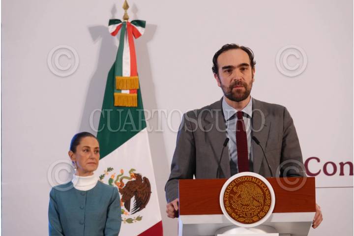 CIUDAD DE MÉXICO, 30OCTUBRE2024.- Andrés Lajous, director general de la Agencia Reguladora de Transporte Ferroviario, acompañado de Claudia Sheinbaum, presidenta constitucional de los Estados Unidos Mexicanos, durante su participación en la conferencia matutina "La Mañanera del Pueblo", realizada en el Salón Tesorería en Palacio Nacional. FOTO: GRACIELA LÓPEZ/CUARTOSCURO.COM