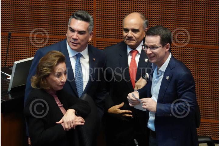 CIUDAD DE MÉXICO, 30OCTUBRE2024.- Los senadores Patricia Murguía, Alejandro Moreno, Manuel Añorve y Ricardo Anaya conversaron durante la Sesión Ordinaria de la Reforma y adiciones a los artículos 4 y 133 de la Constitución Política en materia de bienestar. FOTO: GRACIELA LÓPEZ/CUARTOSCURO.COM