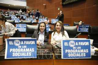 CIUDAD DE MÉXICO, 30OCTUBRE2024.- Las senadoras panistas María Salomé Elyd Sáenz e Ivideliza Reyes durante la sesión en la cual muestran unas pancartas con la leyenda "El PAN a favor de los programas sociales". FOTO: CUARTOSCURO.COM