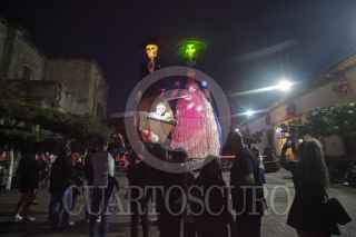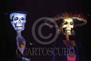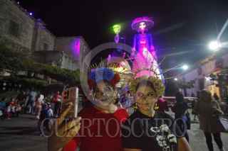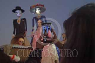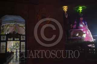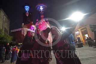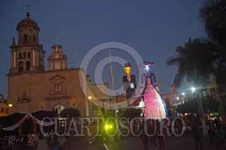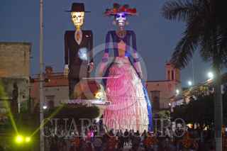 ZAPOTLANEJO, JALISCO. 31OCTUBRE2024.- Una monumental Catrina con su respectivo Catrín de 22 metros de altura y una calavera bebe en su carriola son la mayor atracción en el 15 Festival de Día de Muertos de Zapotlanejo y en la cual participaron artistas locales así como tapeteros de Tlaxcala y Uriangato Guanajuato. FOTO: FERNANDO CARRANZA GARCIA / CUARTOSCURO.COM