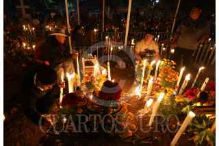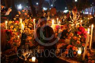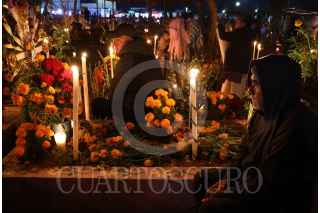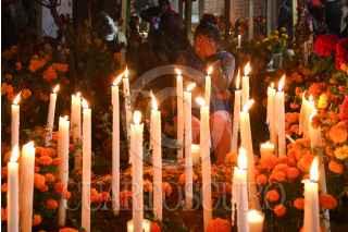 SANTA MARÍA ATZOMPA, OAXACA, 01NOVIEMBRE2024.- Pobladores de Santa María Atzompa, comunidad zapoteca conurbada a la capital de Oaxaca, realizaron la tradicional alumbrada en el panteón de la localidad. Desde la tarde - noche del 31 de octubre, las personas acuden con flores, velas, veladoras, alimentos y música a visitar las tumbas de sus familiares en donde pasan la noche para recibir las almas de sus difuntos de acuerdo a la tradición de Día de Muertos. FOTO: CAROLINA JIMÉNEZ/CUARTOSCURO.COM