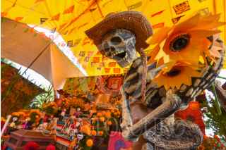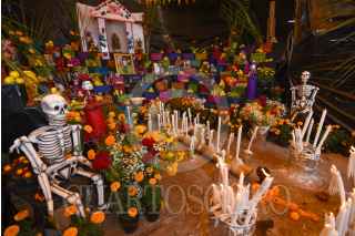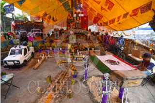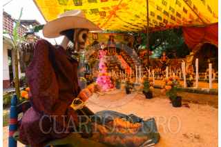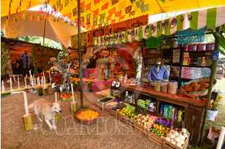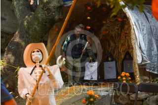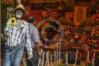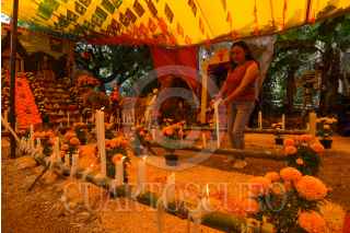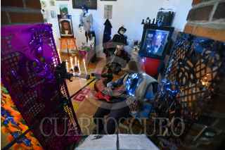 MALINALCO, ESTADO DE MÉXICO, 01NOVIEMBRE2024.- Con ofrendas coloridas y monumentales es como se celebra a los Nuevos Difuntos en Malinalco, los hogares abren sus puertas desde el 28 de octubre hasta el 2 de noviembre a visitantes, en los altares se recrea la vida del fallecido, todos sus gustos y aficiones, en la elaboración las familias llegan a tardarse cerca de 2 meses. Aquellos que visitan las ofrendas llevan una cera o veladora al fallecido lo que representa una luz en su camino y a cambio la familia ofrece dulces, tamales, fruta, pan, ponche, agua o mezcal.FOTO: CRISANTA ESPINOSA AGUILAR /CUARTOSCURO.COM