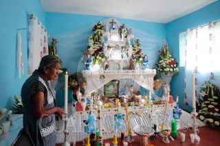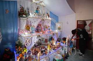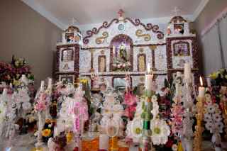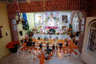 PUEBLA, PUEBLA, 01NOVIEMBRE2024.- Familias del municipio de Huaquechula colocaron los tradicionales altares monumentales que son visitados por decenas de personas. Las ofrendas constan de tres niveles: el primero representa el plano terrenal, en el segundo van los llorones, figuras de barro en forma de niños que representan a los dolientes y en el tercero se representa el cielo. MIREYA NOVO/ CUARTOSCURO.COM