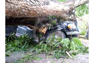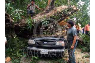 VILLAHERMOSA, TABASCO, 13SEPTIEMBRE2007.- Una mujer y su pequeño hijo viven de milagro al salvarse de morir aplastados por un enorme árbol de mango que pesaba más de dos toneladas cuando circulaban en una camioneta Explorer a la altura del kilometro tres de la carretera Villahermosa-Nacajuca. Ambos se encuentra hospitalizados de gravedad. FOTO: MARCO POLO GUZMÁN HERNÁNDEZ/CUARTOSCUO.COM