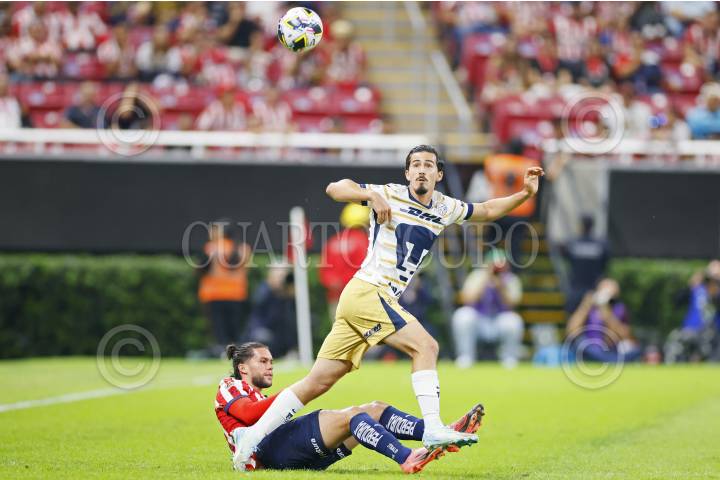 ZAPOPAN, JALISCO, 02NOVIEMBRE2024.-Pablo Bennevendo, jugador de Pumas, disputa el balón con el contrario de Chivas, Cade Cowell, esto en partido correspondiente a la Jornada 15 del Torneo Apertura 2024 de la Liga MX, en donde se enfrentan los equipos de Chivas vs Pumas y en juego que se lleva a cabo en el Estadio Akron, el marcador al momento es de 0-0. FOTO: FERNANDO CARRANZA GARCIA / CUARTOSCURO.COM