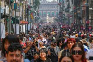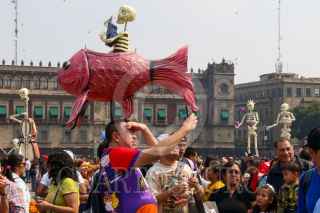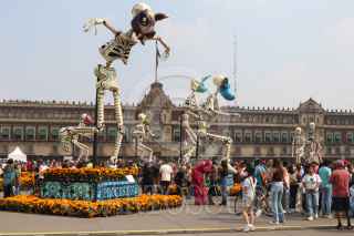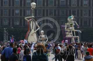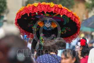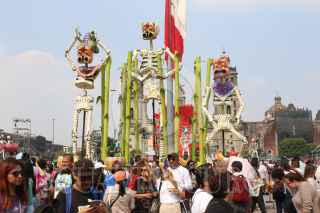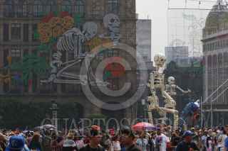 CIUDAD DE MÉXICO, 03NOVIEMBRE2024.- Visitantes abarrotaron la plancha del Zócalo para admirar la exposición de Catrinas Gigantes que fue colocada con motivo de los festejos del Día de Muertos. Los paseantes aprovecharon las colosales calacas de cartonería para tomarse la selfie o foto del recuerdo. FOTO: MOISÉS PABLO/CUARTOSCURO.COM