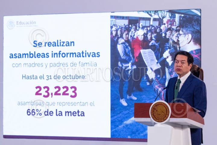 CIUDAD DE MÉXICO, 04NOVIEMBRE2024.- Mario Delgado, titular de la SEP, habló del proceso para entregar las becas Rita Cetina a alumnos y alumnos de secundaria, durante la mañanera del pueblo, en Palacio Nacional. FOTO: MOISÉS PABLO/CUARTOSCURO.COM