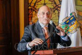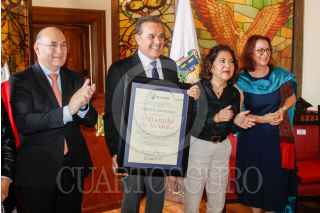 SAN LUIS POTOSI, SAN LUIS POTOSí, 04OCTUBRE2024.- En el marco de la celebración del día de la fundación de San Luis Potosí que cumple 432 años desde que se descubrieron los depósitos de oro y plata en el año de 1592, el presidente municipal Enrique Galindo Ceballos realizó una sesión de cabildo en honor a la fecha donde se le entregó el reconocimiento de “Visitante distinguido” al tenor Fernando de la Mora quien también firmo el libro histórico de visitantes distinguidos de la ciudad. FOTO: MARCELO PALACIOS/CUARTOSCURO.COM