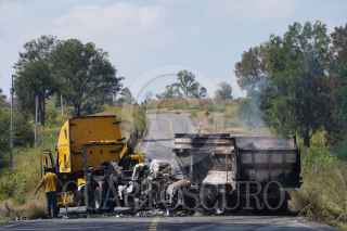 ZINAPECUARO, MICHOACÁN, 05NOVIEMBRE2024.- Resultado de un enfrentamiento entre dos grupos de la delincuencia organizada deja al menos 9 automotores incendiados en los municipios de Zinapécuaro, Charo, Álvaro Obregón, Indaparapeo. De acuerdo con las autoridades policiales, el ataque que realizaron delincuentes contra elementos de la Guardia Civil (GC) alrededor de las 04:00 horas de este martes, tuvo lugar sobre la carretera Zinapécuaro-Acámbaro, a la altura de la población de San José del Rincón, hecho que desató varias quemas de vehículos en municipios colindantes; por fortuna los agentes resultaron ilesos. FOTO: JUAN JOSÉ ESTRADA SERAFÍN /CUARTOSCURO.COM