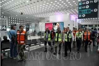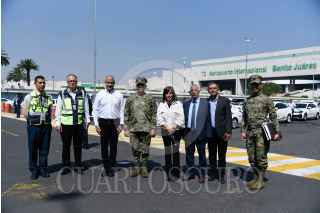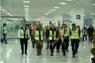 CIUDAD DE MÉXICO, 05NOVIEMBRE2024.- En el marco del 96 aniversario de operaciones del Aeropuerto Internacional Benito Juárez Ciudad de México (AICM), el secretario de Infraestructura, Comunicaciones y Transportes (SICT), Jesús Antonio Esteva Medina, y el secretario de Marina, Almirante Raymundo Pedro Morales Ángeles, realizaron un recorrido por dichas instalaciones. En compañía de la subsecretaria de Comunicaciones y Transportes, Tania Carro Toledo; el director general del AICM, Contralmirante José Ramón Rivera Parga, y el director general del Grupo Aeroportuario de la Ciudad de México (GACM), Juan Padilla Olmos, los secretarios visitaron la Terminal 1 y la Terminal 2 del aeropuerto capitalino. En la Terminal 1, en el área internacional acudieron al Centro de Monitoreo, donde se registra el movimiento aeroportuario que permite confirmar, mediante el control de cámaras de seguridad, su buen funcionamiento en el movimiento de pasajeras y pasajeros. FOTO: SICT/CUARTOSCURO.COM