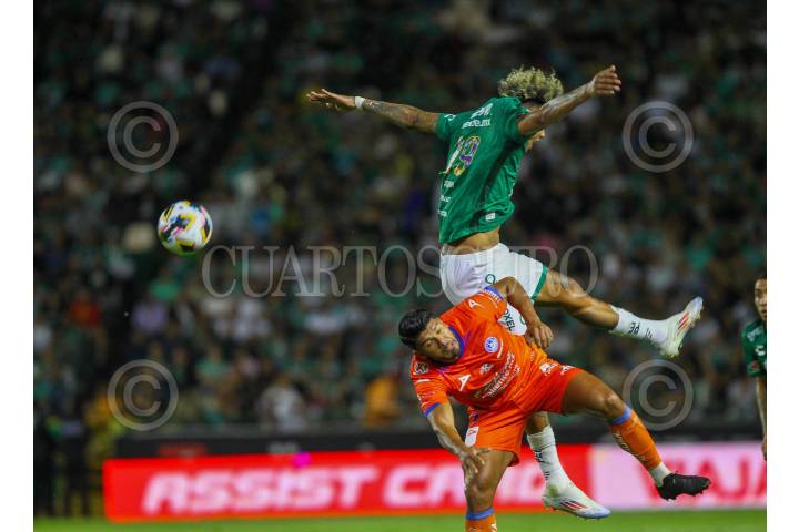 LEON, GUANAJUATO, 05NOVIEMBRE2024.- El León empató a cero goles con el Mazatlán. Los dirigidos por Manuel Vucetich nada pudieron hacer ante el local. Partido correspondiente a la jornada 16 de la Liga MX, que se jugó en el Estadio León. En la imagen Jair Díaz (Mazatlán) vs Jhoder Cádiz (León). FOTO: JORGE ORTEGA/CUARTOSCURO.COM