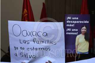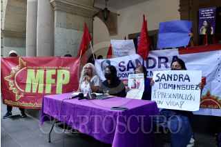 OAXACA, OAXACA, 06NOVIEMBRE2024.- A 33 días de su desaparición, familiares, amigos y organizaciones demandaron la presentación con vida de la defensora y abogada Ayuujk, Sandra Estefana Domínguez Martínez. Las hermanas de Sandra y su madre, Araceli Martínez, denunciaron intimidaciones y hostigamiento, además de revictimización de autoridades en contra de la defensora, por ello decidieron instalarse en plantón frente al acceso principal del Palacio de Gobierno de Oaxaca. En el estado se han reportado 686 desapariciones de mujeres durante la actual administración que encabeza el morenista, Salomón Jara Cruz. FOTO: SANDRA DOMÍNGUEZ/CUARTOSCURO.COM