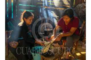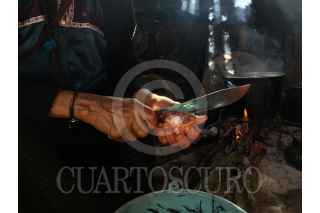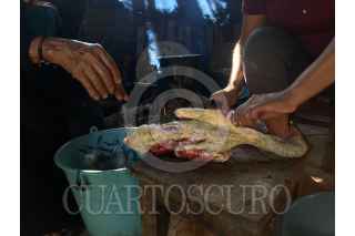 SAN JUAN CHAMULA, CHIAPAS, 06NOVIEMBRE2024.- La familia Vet se dispone a cortar un pollo después de ser utilizado en un ritual para limpiar a una persona. Se limpian las plumas, se empieza a cortar para observar si hay alguna energía negativa que quedará después del ritual. FOTO: ISABEL MATEOS/CUARTOSCURO.COM