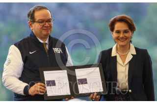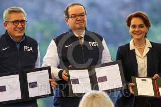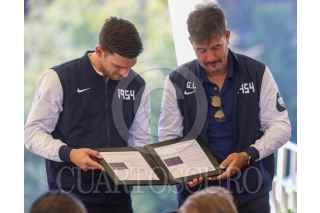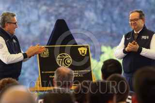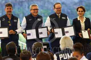 CIUDAD DE MÉXICO. 06NOVIEMBRE2024.- Leonardo Lomeli, rector de la UNAM, acompañado de Luis Raúl González, y la directora de servicio postal, Violeta Abreu encabezaron la develación de la conmemoración del 70 aniversario del Club de fútbol de la Universidad. Además de la cancelación de la estampilla del servicio postal Mexicano el evento de realizó en la Cantera universitaria. FOTO: VICTORIA VALTIERRA/CUARTOSCURO.COM
