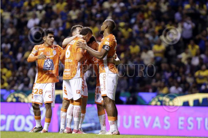 PUEBLA, PUEBLA, 6NOVIEMBRE2024.- Jugadores en festejo de gol durante el partido entre las Aguilas del America y los Tuzos del Pachuca, correspondiente a la jornada 16 del torneo Apertura 2024 de la Liga BBVA MX, celebrado en el Estadio Cuauhtémoc. FOTO: MIREYA NOVO/ CUARTOSCURO.COM