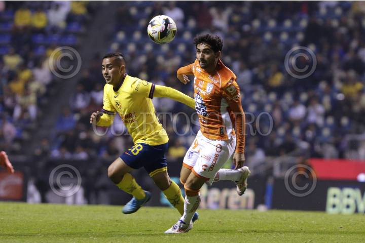 PUEBLA, PUEBLA, 6NOVIEMBRE2024.- Erick Sanchez y Sergio hernández durante el partido entre las Aguilas del America y los Tuzos del Pachuca, correspondiente a la jornada 16 del torneo Apertura 2024 de la Liga BBVA MX, celebrado en el Estadio Cuauhtémoc. FOTO: MIREYA NOVO/ CUARTOSCURO.COM