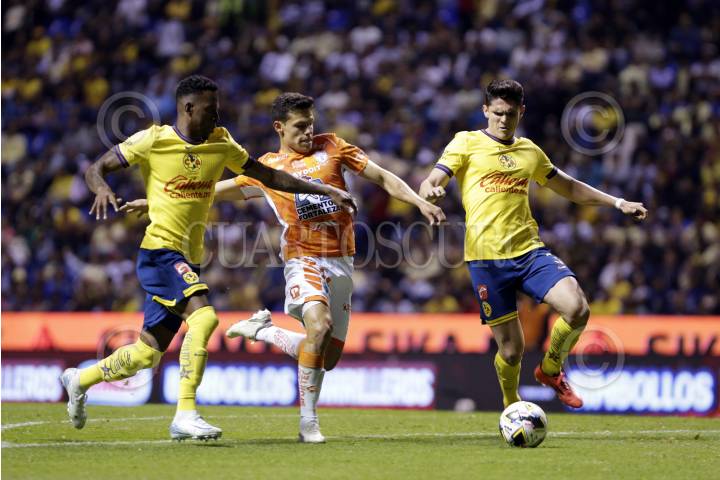 PUEBLA, PUEBLA, 6NOVIEMBRE2024.- Cristian Borja, Arturo González e Israel Reyes durante el partido entre las Aguilas del America y los Tuzos del Pachuca, correspondiente a la jornada 16 del torneo Apertura 2024 de la Liga BBVA MX, celebrado en el Estadio Cuauhtémoc. FOTO: MIREYA NOVO/ CUARTOSCURO.COM