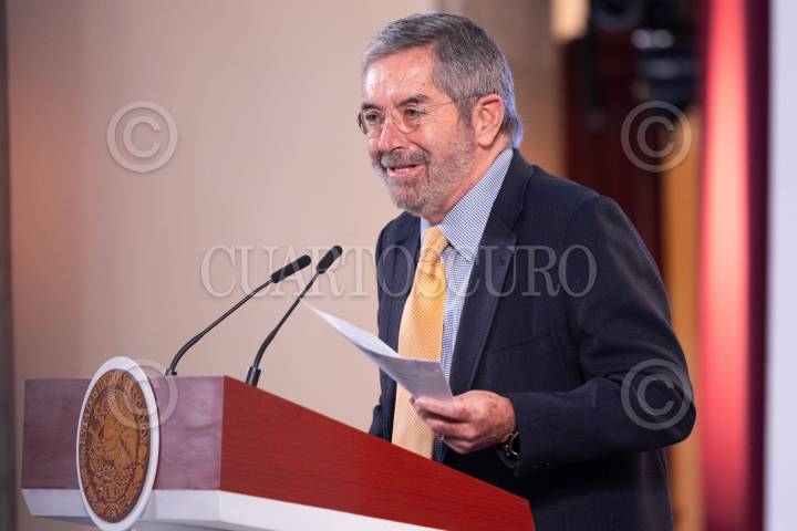 CIUDAD DE MÉXICO, 08NOVIEMBRE2024.- Juan Ramón de la Fuente, secretario de Relaciones Exteriores; habló sobre los primeros acercamientos que ha tenido el gobierno de Claudia Sheinbaum con el recién ganador de la elecciones estadounidenses Donald Trump, durante la mañanera del pueblo. FOTO: PRESIDENCIA/CUARTOSCURO.COM