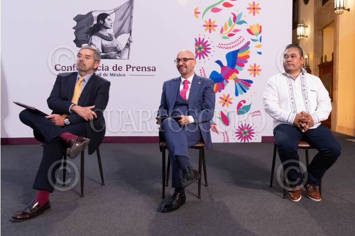 CIUDAD DE MÉXICO, 08NOVIEMBRE2024.- Juan Ramón de la Fuente, secretario de Relaciones Exteriores; Octavio De la Torre de Stéffano, presidente de la Confederación de Cámaras Empresariales (CONCANACO SERVYTUR) y Bulmaro Juárez Pérez, Instituto Nacional de las lenguas indígenas, durante la mañanera del pueblo. FOTO: PRESIDENCIA/CUARTOSCURO.COM