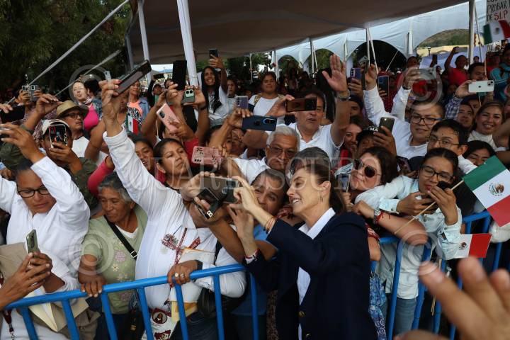 VILLA DE ZARAGOZA, SAN LUIS POTOSÍ, 08NOVIEMBRE2024.- Claudia Sheinbaum Pardo, presidenta de México, se fotografío con asistentes al anuncio de entrega de la Pensión Mujeres Bienestar en la localidad. FOTO: PRESIDENCIA/CUARTOSCURO.COM