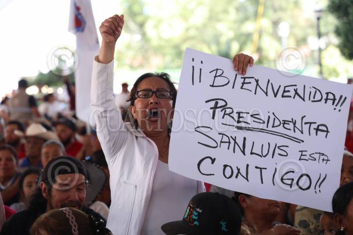 VILLA DE ZARAGOZA, SAN LUIS POTOSÍ, 08NOVIEMBRE2024.- Una mujer expresa su apoyo a la presidenta Claudia Sheinbaum durante el anuncio de entrega de la Pensión Mujeres Bienestar en la localidad. FOTO: PRESIDENCIA/CUARTOSCURO.COM
