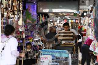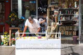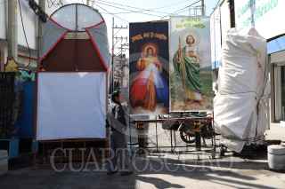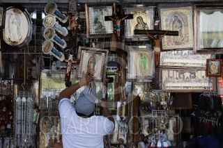 CIUDAD DE MÉXICO, 11NOVIEMBRE2024.- Un vendedor coloca su mercancía en uno de los locales que se encuentran a las afueras de la Basílica de Guadalupe. FOTO: DANIEL AUGUSTO/ CUARTOSCURO.COM