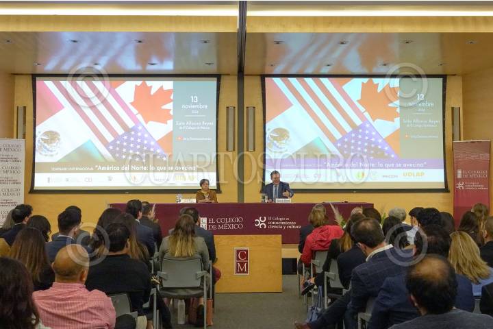CIUDAD DE MÉXICO, 13NOVIEMBRE2024.- Celia Toro, catedrática del Colegio de México y Marcelo Ebrard Secretario de Economía, durante el Seminario Internacional de America del Norte: Lo que se avecina, evento realizado en el Colegio de México. FOTO: ROGELIO MORALES /CUARTOSCURO.COM