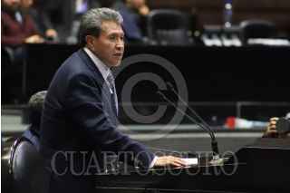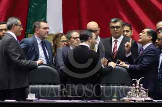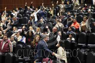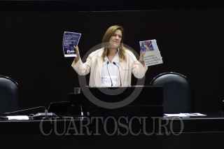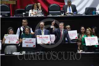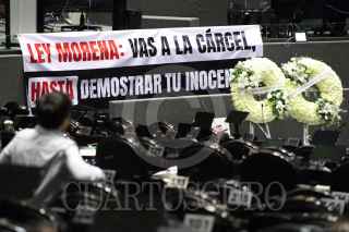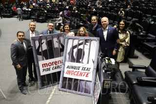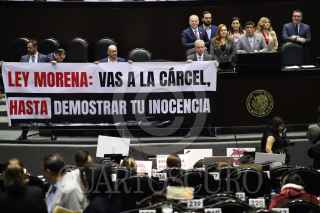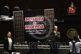 CIUDAD DE MÉXICO, 13NOVIEMBRE2024.- Diputados muestran una cartulina con la leyenda "Dictadura de Morena, corrupción, opacidad y más pobreza". FOTO: DANIEL AUGUSTO/ CUARTOSCURO.COM