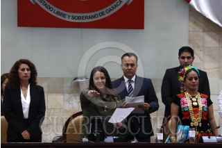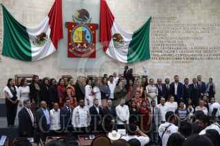 OAXACA, OAXACA, 13NOVIEMBRE2024.- 25 diputadas y 17 diputados locales tomaron protesta esta mañana para un periodo de 3 años al frente de la LXVI Legislatura de Oaxaca. Por tercera ocasión, esta legislatura está conformada en su mayoría por mujeres y por primera vez cuenta con un diputado migrante, el legislador Zeferino García Jerónimo. La mesa directiva para el primer año de ejercicio legislativo quedó conformada en su totalidad por mujeres y será presidida por Natividad Díaz Jiménez. Al acto de instalación legislativa, acudió el gobernador del estado Salomón Jara Cruz y funcionarios de su gobierno. FOTO: CAROLINA JIMÉNEZ/CUARTOSCURO.COM