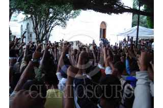 CHILPANCINGO, GUERRERO, 13SEPTIEMBRE2007. Egresados de la normal rural de Ayotzinapa protestaron afuera de la catedral de Santa Maria de la Asuncion para exigir la entrega de plazas para maestros rurales, cabe mencionar que en el interior de dicho edificio historico se desarrollaba la ceremonia oficial del 194 aniversario de la instalacion del "Primer Congreso de Anahuac" la cual fue presidida por el gobernador del estado Zeferino Torreblanca Galindo, suscitandose conatos de enfrentamiento entre los normalistas y policias del estado, quienes resguardaban el lugar desde temprana hora. FOTO.OSCAR ALVARADO/CUARTOSCURO.COM