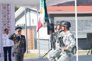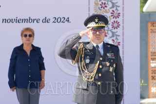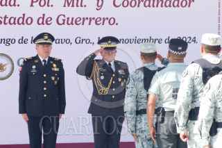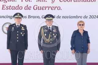 CHILPANCINGO, GUERRERO, 14NOVIEMBRE2024.- El Comisario Ulises Orduña Campos, fue relevado del cargo de Coordinador estatal de la Guardia Nacional en Guerrero, tomando protesta el General Brigadier del Estado Mayor, Gregorio Espinoza Toledo, quien también fungirá como Comandante de la 9/a Brigada de la Policía Militar. Orduña Campos fue relevado luego de casi tres meses de permanecer en el cargo, tomó protesta el pasado 19 de agosto. En ceremonia de Toma de Posesión al Cargo y Protesta de Bandera, se dio a conocer que el Comisario Gregorio Toledo, el amplio historial militar y académico con el que cuenta, iniciando como cadete militar en el año de 1986, además de contar con una Master oficial universitario en estudios sobre Terrorismo por la Universidad Internacional de La Rioja en España, además de formar cadetes en el Colegio militar, así como cursos superiores de Guerra y tener una maestría en Seguridad Nacional, entre otros. FOTO: DASSAEV TÉLLEZ ADAME/CUARTOSCURO.COM