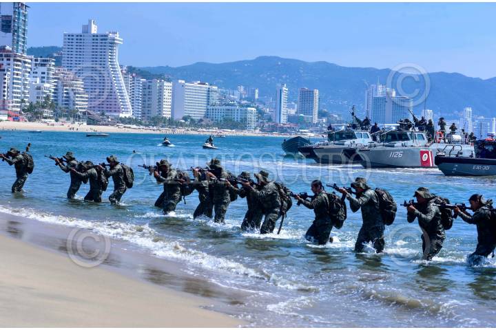 ACAPULCO, GUERRERO, 16NOVIEMBRE2024.- Agentes la Secretaria de Marina Armada de México una exhibición anfibia de rescate, detención y toma de playa, los agentes portaron armas de grueso calibre, y se utilizarán para la exhibición un helicóptero y embarcaciones, la exhibición se realizó en playa Papagayo de Acapulco, con presencia de turistas. FOTO: CARLOS CARBAJAL/CUARTOSCURO.COM