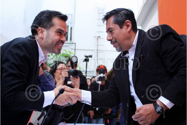 CIUDAD DE MÉXICO, 19NOVIEMBRE2024.- Jorge Álvarez Máynez y el secretario de la Comisión Nacional de Convenciones y Procesos Internos, Alberto Tlaxcalteco, durante la entrega de documentación del ex candidato presidencial par registrarse cómo aspirante a la dirigencia nacional ante el partido. FOTO: GALO CAÑAS/CUARTOSCURO.COM