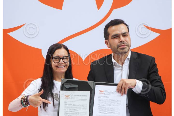 CIUDAD DE MÉXICO, 19NOVIEMBRE2024.- Julieta Macías Rábago, presidenta de la Comisión Nacional de Convenciones y Procesos Internos de Movimiento Ciudadano, y Jorge Álvarez Máynez durante la entrega de documentación del ex candidato presidencial par registrarse cómo aspirante a la dirigencia nacional ante el partido. FOTO: GALO CAÑAS/CUARTOSCURO.COM