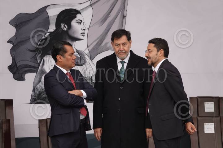 CIUDAD DE MÉXICO, 20NOVIEMBRE2024.- Sergio Gutiérrez Luna, presidente de la mesa directiva de la Cámara de Diputados; Gerardo Fernández Noroña, presidente de la mesa directiva en el Senado, y Martí Batres, director del ISSSTE, conversaron durante el pase de Revista de 114 Aniversario de la Revolución Mexicana, realizada en el Zócalo capitalino. FOTO: GRACIELA LÓPEZ/CUARTOSCURO.COM