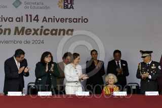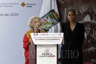 PUEBLA, PUEBLA, 20NOVIEMBRE2024.- La escritora y periodista Elena Poniatowska, asistió a la Ceremonia Conmemorativa al 114 aniversario de la Revolución Mexicana de Puebla, donde recibió la medalla Carmen Serdán por su trayectoria. MIREYA NOVO/ CUARTOSCURO.COM