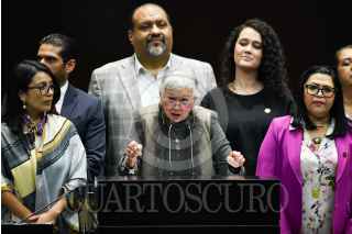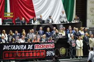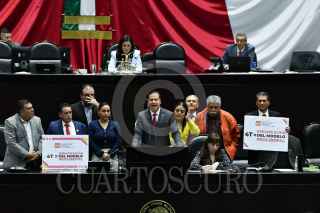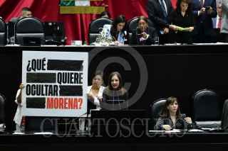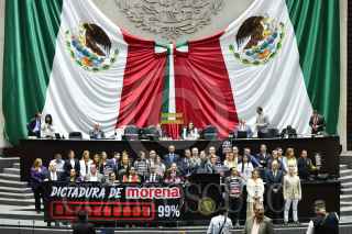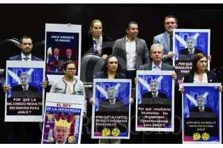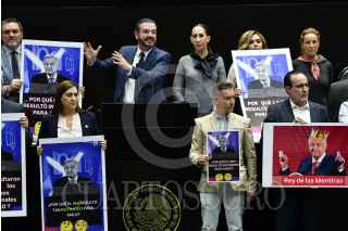 CIUDAD DE MÉXICO, 20NOVIEMBRE2024.- Legisladores del PAN, muestran cartulinas con la imagen de Andrés Manuel López Obrador, ex presidente de México, mientras se pronuncian en contra del dictamen en materia de simplificación orgánica, la cual plantea la desaparición de los organismos autónomos: INAI, CRE, IFT y COFECE. FOTO: MARIO JASSO/CUARTOSCURO.COM