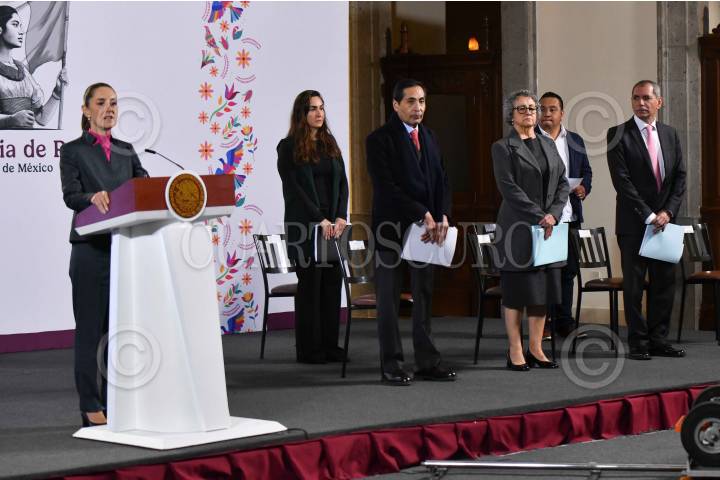 CIUDAD DE MÉXICO, 22NOVIEMBRE2024.- Claudia Sheinbaum, presidenta de México, durante la conferencia matutina realizada en Palacio Nacional, en la que se habló sobre los lineamientos y desglose del paquete económico 2025. La acompañan: Rogelio Ramírez de la O, secretario de Hacienda y Crédito Público; Bertha Gómez Castro, subsecretaria de Egresos de la Secretaría de Hacienda y Crédito Público; Edgar Amador Zamora , subsecretario de Hacienda y Crédito Público; Rodrigo Mariscal Paredes, jefe de la Unidad de Planeacion Económica de la Secretaría de Hacienda y Crédito Público; María del Carmen Bonilla, titular de la Unidad de Crédito Público, y Bulmaro Juárez Sánchez, divulgador de Lenguas Indigenas. FOTO: MARIO JASSO/CUARTOSCURO.COM