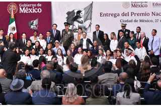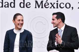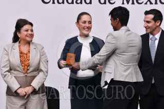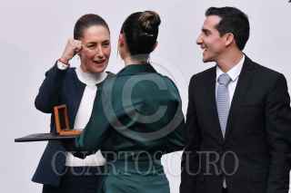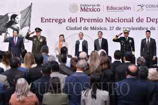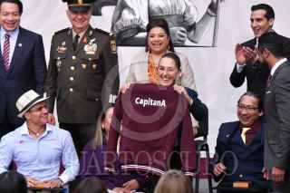 CIUDAD DE MÉXICO, 27NOVIEMBRE2024.- Claudia Sheinbaum, presidenta de México, recibió una chamarra con la palabra "CapitanA" durante la ceremonia de entrega del Premio Nacional de Deportes, realizada en Palacio Nacional. FOTO: MARIO JASSO/CUARTOSCURO.COM