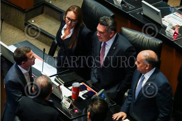 CIUDAD DE MÉXICO, 28NOVIEMBRE2024.- El senador panista Ricardo Anaya conversa con el coordinador priista Alejandro Moreno Cárdenas y el senador Manuel Añorve durante la sesión ordinaria del Senado de la República en que se ratificó a Raquel Buenrostro como secretaria de la Función Pública y posteriormente la discusión sobre la eliminación de Órganos Autónomos. FOTO: GALO CAÑAS/CUARTOSCURO.COM