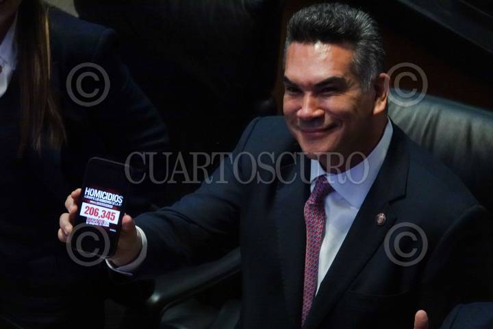 CIUDAD DE MÉXICO, 28NOVIEMBRE2024.- El coordinador priista Alejandro Moreno Cárdenas muestra su celular con la presunta cifra de homicidios en los gobiernos morenistas durante la sesión ordinaria del Senado de la República en que se ratificó a Raquel Buenrostro como secretaria de la Función Pública y posteriormente la discusión sobre la eliminación de Órganos Autónomos. FOTO: GALO CAÑAS/CUARTOSCURO.COM